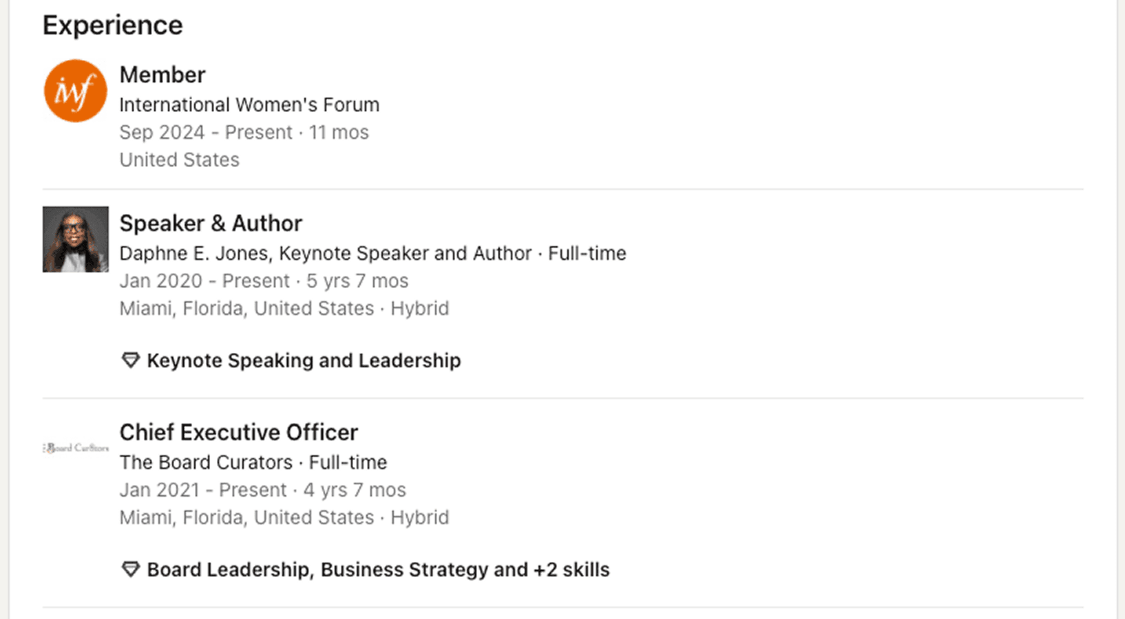 Experience Line: title yourself “Founder & Keynote Speaker,” then list each signature talk under the media gallery with a thumbnail and 75-character punchy summary.