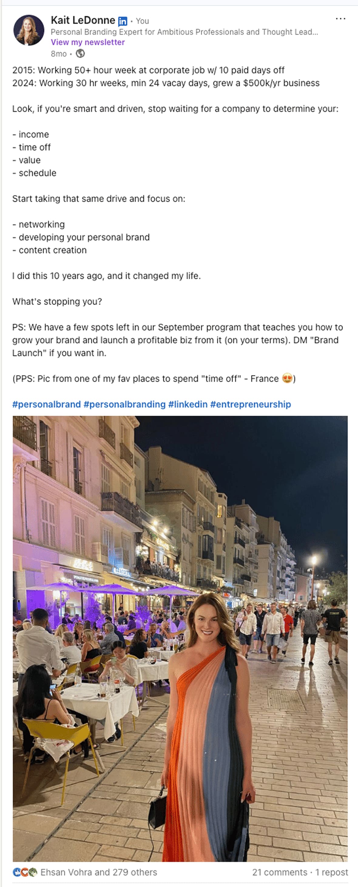 I felt that Kait LeDonne's 30-Day LinkedIn Brand Builder Program was designed specifically for me! It was intense, comprehensive, and high-touch. I had to reexamine my current LinkedIn brand, pinpoint its weaknesses, identify better options, and establish a stronger brand presence. Kait was there all along, coaching and motivating us to strive for higher goals. Results: by the third week, my LinkedIn contacts and posts' views and reactions spiked. I am receiving more invitations to be a podcast guest. And I am feeling more confident, clearer, and determined to continue what I've learned in this course.