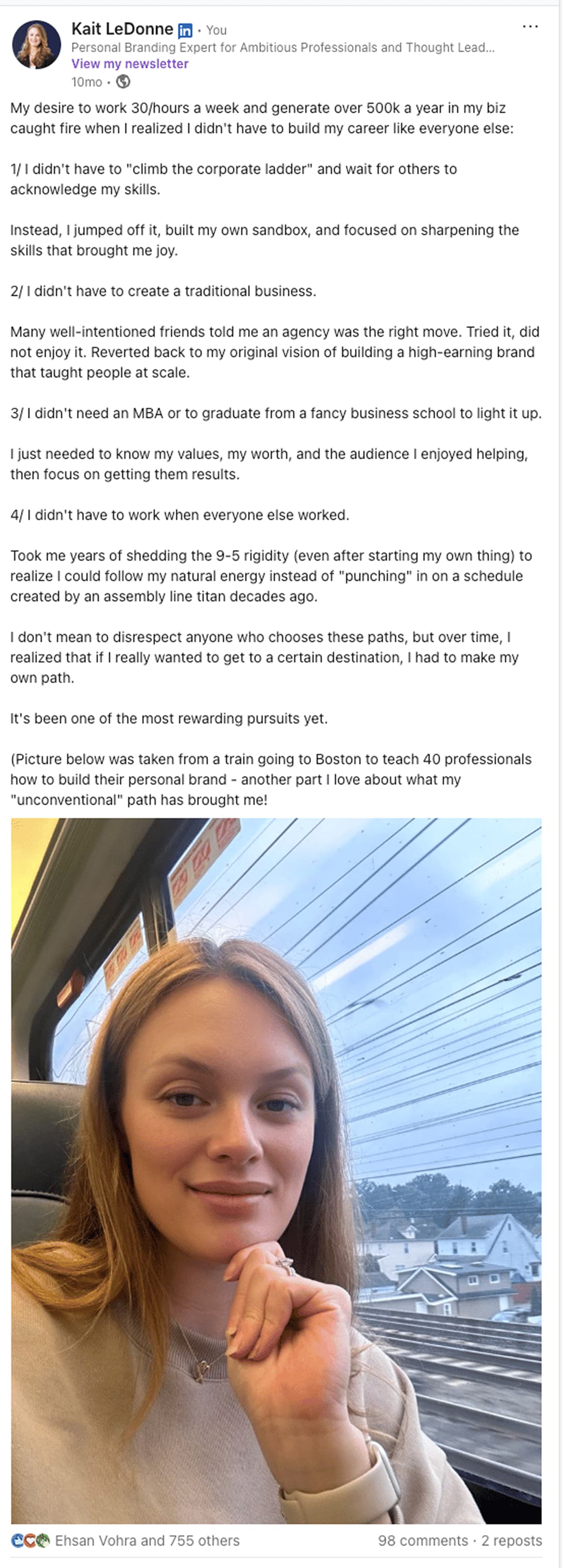By lunch, the post had detonated: over 500 reactions, 60 comments, and DMs from strangers asking, “How?” (Also some nasties like “Oh, good for you and your selfies.” Hey, sometimes the nasties are yet another KPI that you’re posts are poppin’.)
