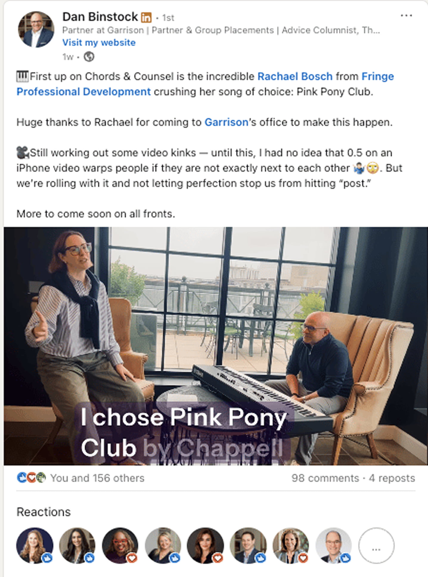 I had a former student, Dan Binstock, do this in masterclass fashion with one of his passions, which is playing music. While the majority of his personal brand content centers on helping partners get placed at top-tier law firms (that’s his business), every so often, he now shares his “Chords and Counsel” series, which is part of his passion for music. It doesn’t hurt that he’s covering bangers like “Pink Pony Club.”