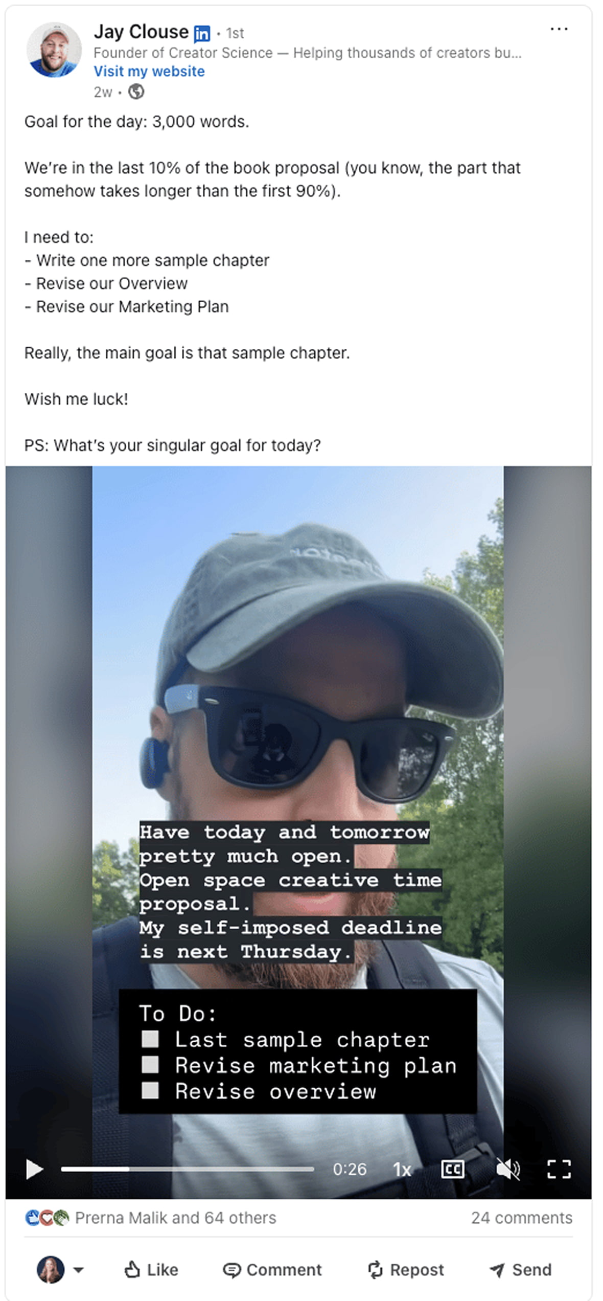 Creator Jay Clouse understands the value of “building out loud” as he posts about his book journey, starting at (get this!) proposal updates. Bravo.