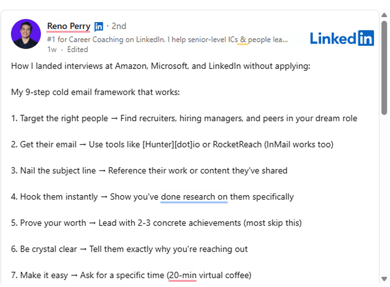 💡Why it works: Both posts elevate you from résumé reciter to mentor. When readers bookmark practical advice, it boosts the “save” metric, a signal LinkedIn now weighs more heavily than likes.