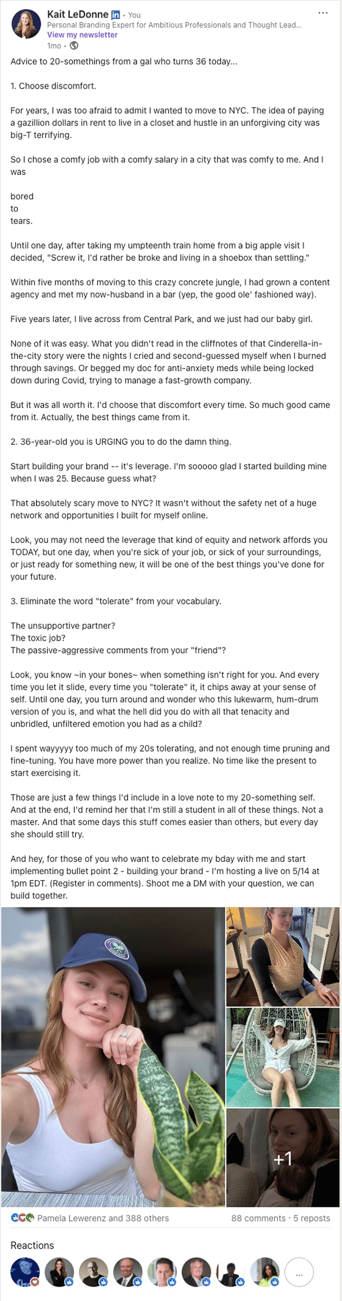 Write a reflective note addressed to your younger self—“Advice to the 22-year-old me who thought hard work was enough.” Speak directly to newcomers in your field, then invite readers to add the wisdom they wish they’d known. Replies that tag friends (“You need to read this, Julie!”) expand visibility into fresh networks without feeling forced.