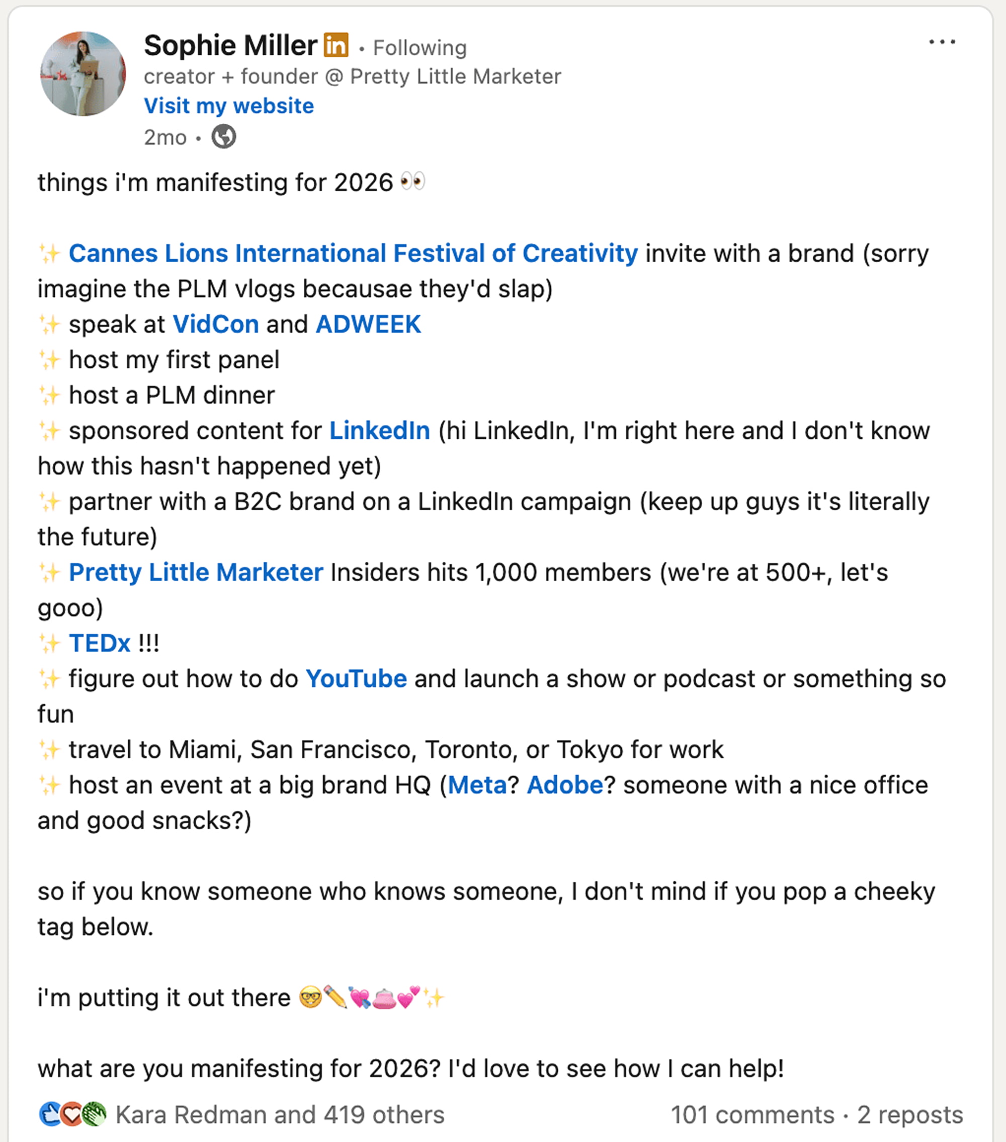 Sophie Miller, of The Pretty Little Marketer fame, did this masterfully at the beginning of 2026. I guarantee you that at least 50% of these things happen for her. The comments section was, of course, full of ideas, intros, and tags: