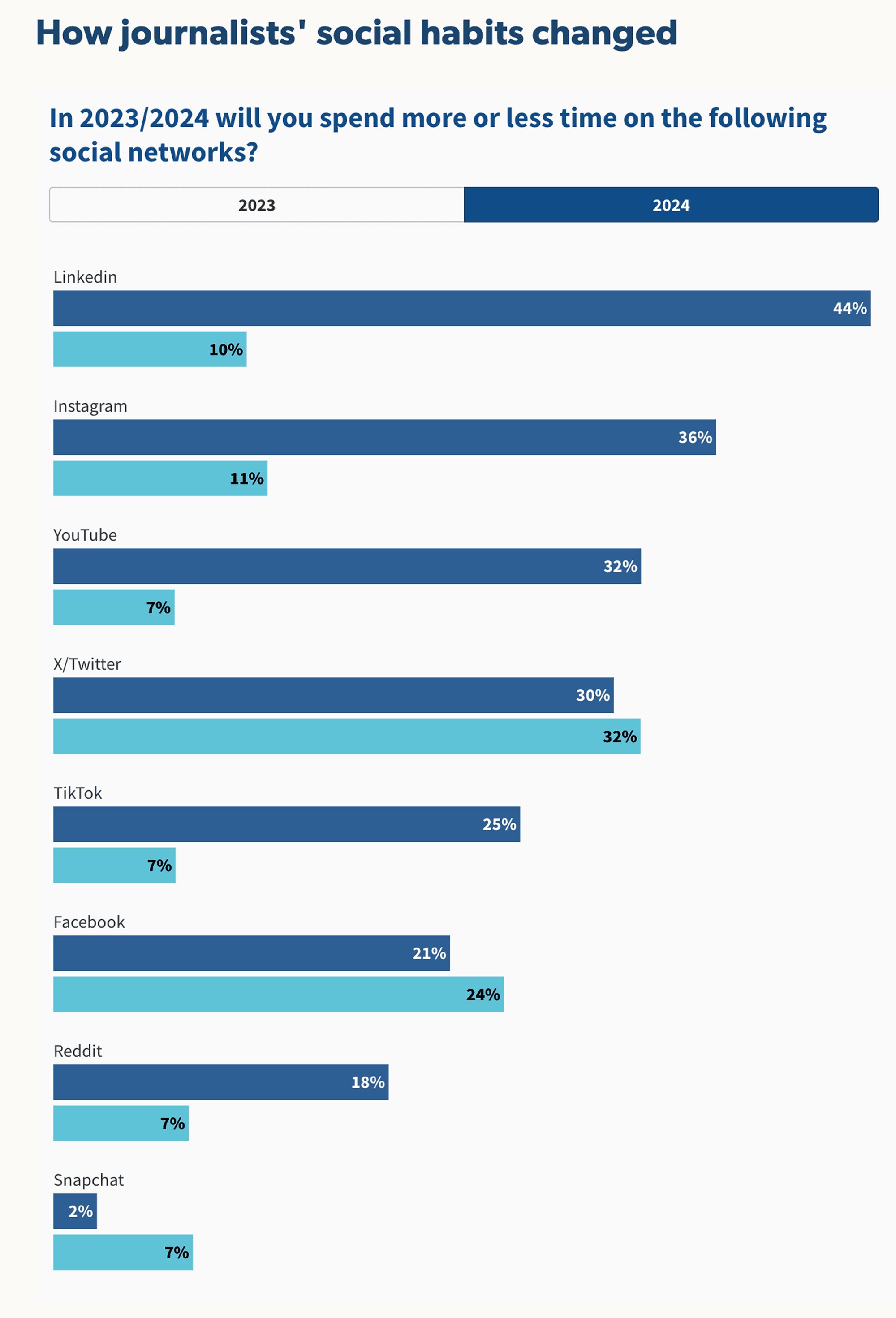 In 2011, Forbes touted the widely-sourced statistic that 94.2% of journalists use LinkedIn to find sources. Now, that figure needs a little bit of calibration. Enter Muckrack’s findings on how journalists planned to engage with social media platforms in 2024 from their “The State of Journalism, 2024” report: