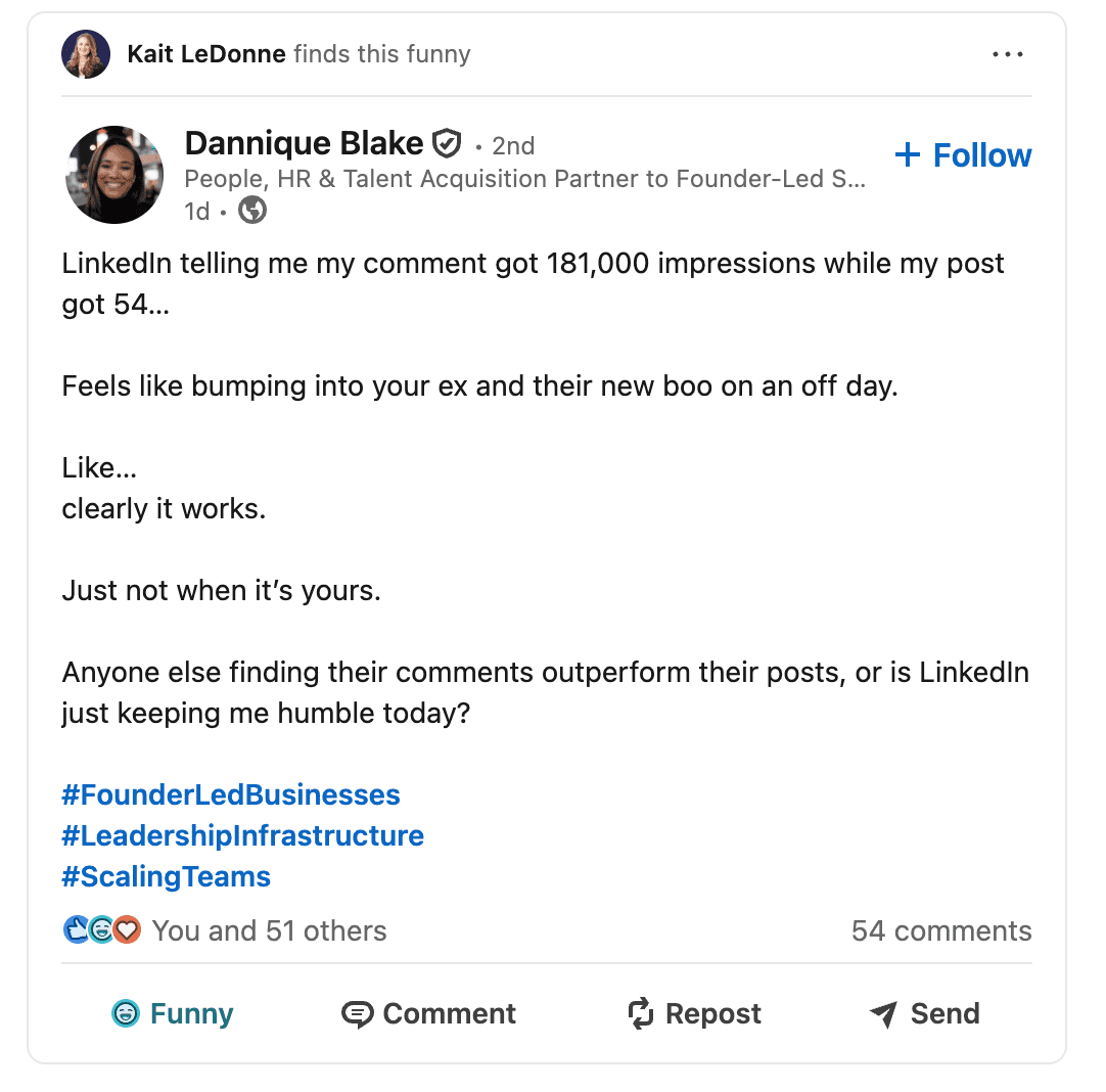 The comment section matters here too, probably more now than ever, as people are raking it in with massive comment impressions. I lol-ed at this post from Dannique Blake, which summed it up well:
