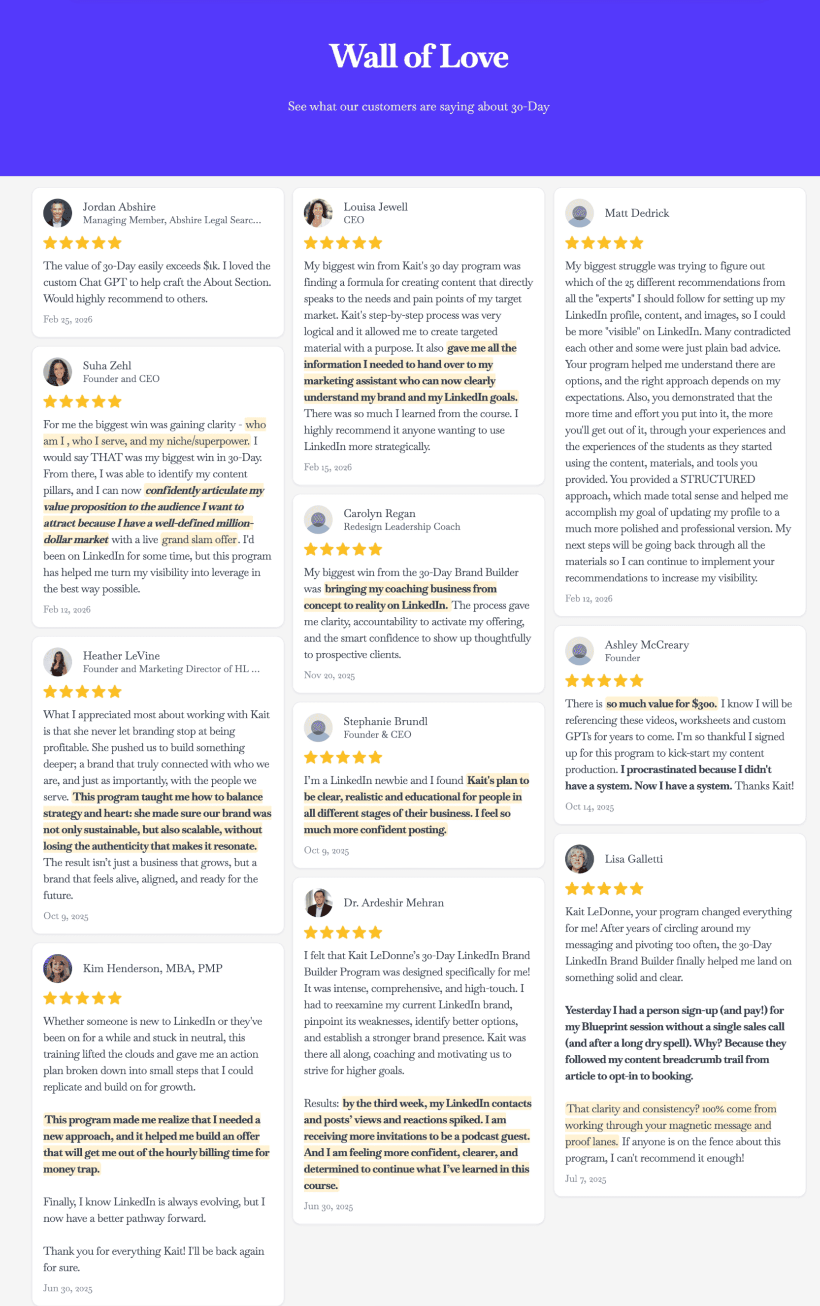 Her LinkedIn audience and "Build a Brand" newsletter community exceeds 80,000 professionals. She has delivered training for organizations, including the United States Air Force and Kia. Listed by Favikon among the Top Personal Branding Influencers in the U.S., Kait is frequently cited in the media for clear, results-driven personal brand strategies professionals can sustain.